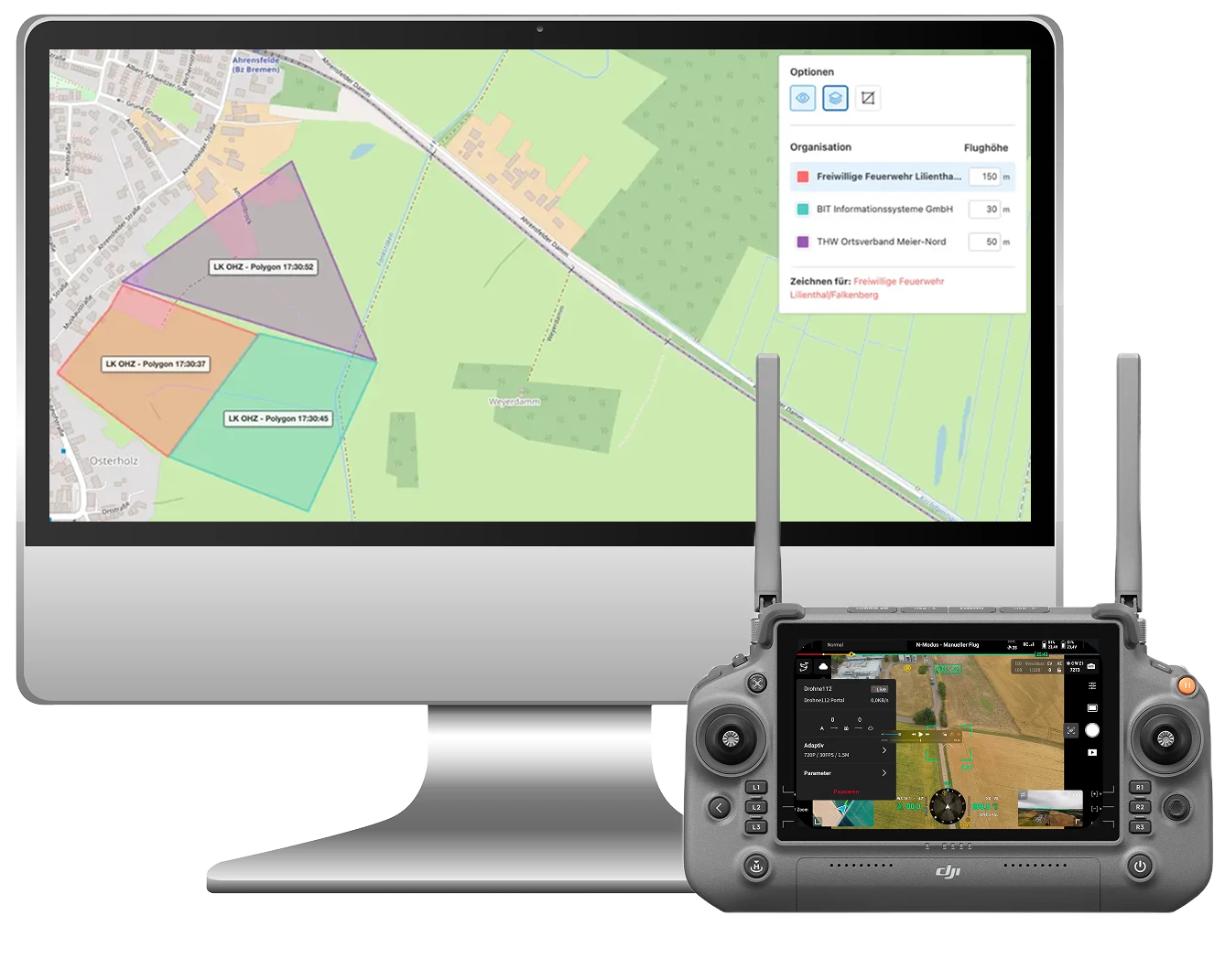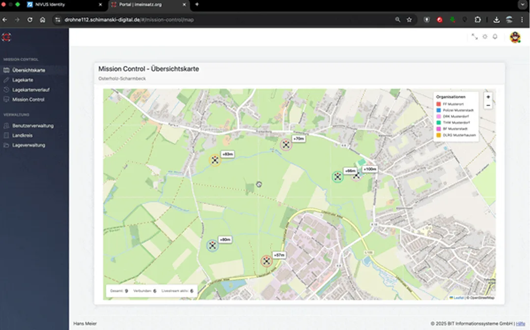 Es besteht die Möglichkeit, als Landkreis, TEL oder übergeordnete Einheit mehrere Drohnen im System teamübergreifend zu betrachten. Neben der Möglichkeit auf einer Karte die Position sämtlicher Drohnen zu sichten, kann auf der neuen Lagekarte für alle angeschlossenen Einheiten auch gezeichnet werden. So können Suchgebiete zwischen Einheiten sinnvoll aufgeteilt und abgearbeitet werden. Die Livebilder können strukturiert erhoben, aufbereitet und sicher abgespeichert werden.