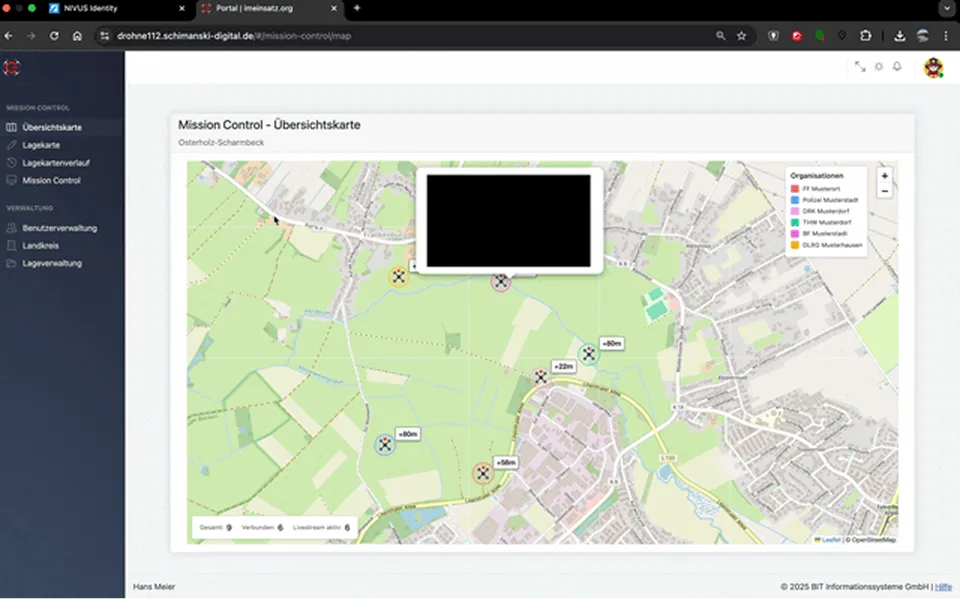 Mit dem BOS-Webportal ermöglichen wir BOS-Einheiten den digitalen Zugriff auf alle relevanten Daten und Livestreams von Drohneneinsätzen – browserbasiert oder per App, datenschutzkonform und einsatzbereit in wenigen Minuten. Weiteres Modul: Über das zusätzliche Landkreis-Ebene-Modul besteht die Möglichkeit, als Landkreis, TEL oder übergeordnete Einheit mehrere Drohnen im System teamübergreifend zu betrachten. Wähle dazu im Drop-Down das Landkreis-Modul.